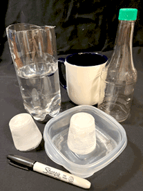Preparing the first experiment: Fill your cylindrical container about two-thirds full of cool tap water. On the side of the container, mark the level of the liquid in the container. Add one of your micro "icebergs" to the container and put the other one in the empty cup or bowl. (Alternately, add a few freezer-tray ice cubes to the water in the cylinder and the same number to the cup.) Mark the level of the liquid in the cylindrical container. Set it aside while you think about the questions in the following two paragraphs.