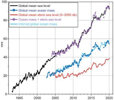 As water warms, it increases in volume (thermal expansion) and adds another factor to the rise of sea level, as shown in the figure below. As the warming sea expands in volume, its surface has to rise, since the liquid is constrained to stay inside its “container”, as in your experiment. Thus, rising sea level is caused by water added from melting land ice and volume increase from thermal expansion. Global warming is responsible for both these effects. Modern remote sensing techniques make it possible to measure the overall rise in sea surface level as well as the individual contributions of ice melt and thermal expansion shown in the figure. Since 1993, satellites have been measuring the sea level (averaged over the globe). Its rise is evident from the graphical representation. The effect of added water from ice melt is found by determining the change in mass of the ocean. This is done with data from a pair of satellites that measure the change in gravitational attraction caused by the increasing mass of the ocean. The effect of thermal expansion is determined from the change in temperature of the ocean and the known increase in volume per degree temperature rise. The temperature is measured by an array of several thousand floats (called “Argo”) distributed throughout the ocean and periodically reporting their data via radio signals. These results are a few among many that are evidence that the Earth is warming and causing many changes that affect all life on the planet.