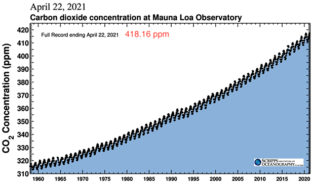 Our instrumental record of the concentration of atmospheric CO2, Figure 1, at the Mauna Loa observatory on the island of Hawaii began in 1958. Previous measurements from gases trapped in ice cores from Greenland and Antarctica show that the concentration was 260 to 280 ppm (parts per million by volume) for at least 10,000 years before 1800, when the concentration began to rise, reached 418 ppm in spring 2021, and continues to rise. Using what we know about the Earth and its atmosphere and further data on the isotopic composition of the CO2, we can find the mass of atmospheric CO2 and a clue to the source of the increase since 1800. |