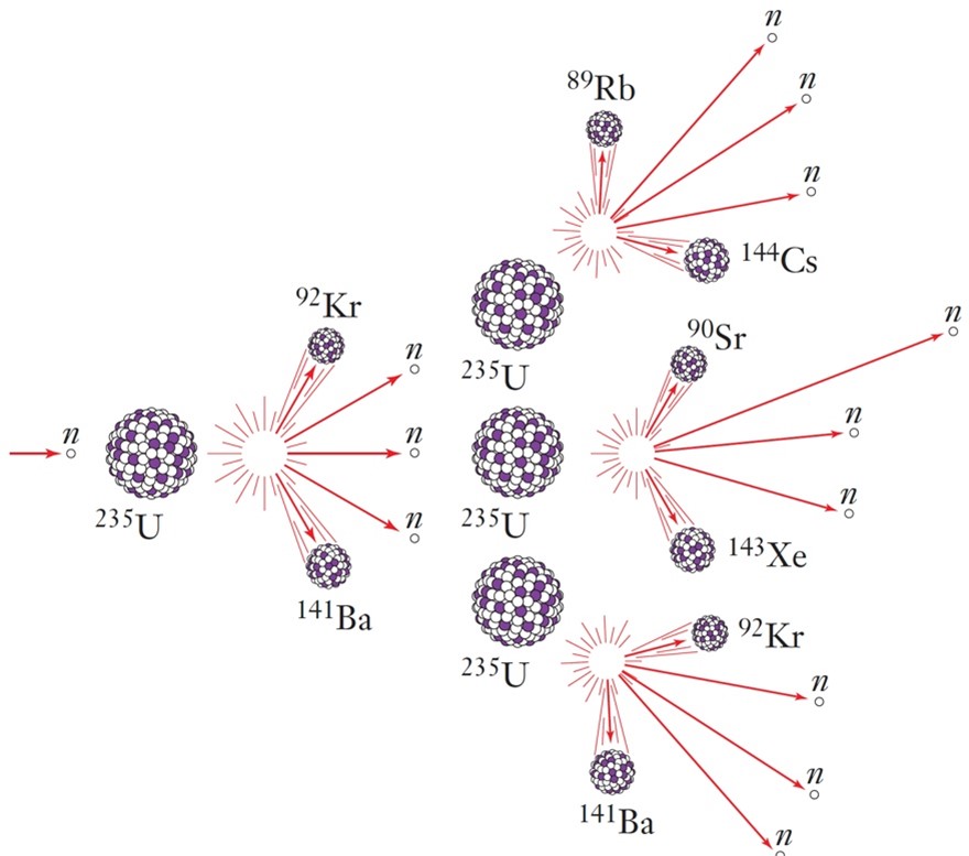 A few of the heavy periodic table elements have nuclei that undergo spontaneous fission, breaking apart into lighter nuclei. The fission reaction can be stimulated by collision with a neutron, 1n0, as in this uranium-235 example from Figure 1: 235U92+ + 1n0 → 141Ba56+ + 92Kr36+ + 3 1n0, This split of the 235U92+ nucleus is typical, but many others also occur that yield other elemental nuclei, generally clustered around the mass numbers of the product isotopes shown in this example. Note that one reactant neutron produces three product neutrons. In a sample with lots of 235U92+, this single event can trigger three more, then nine more, then… a chain reaction, as shown in Figure 1. In a nuclear reactor, the chain is controlled by capturing some of the neutrons to slow the chain and the energy released is used to produce electricity. In an atomic bomb, the chain is not controlled, and the enormous energy release creates an explosion. (We have not yet been able to produce controlled nuclear fusion reactions for power generation. But we have created uncontrolled fusion reactions triggered by an atomic explosion to produce so-called hydrogen bombs.) |